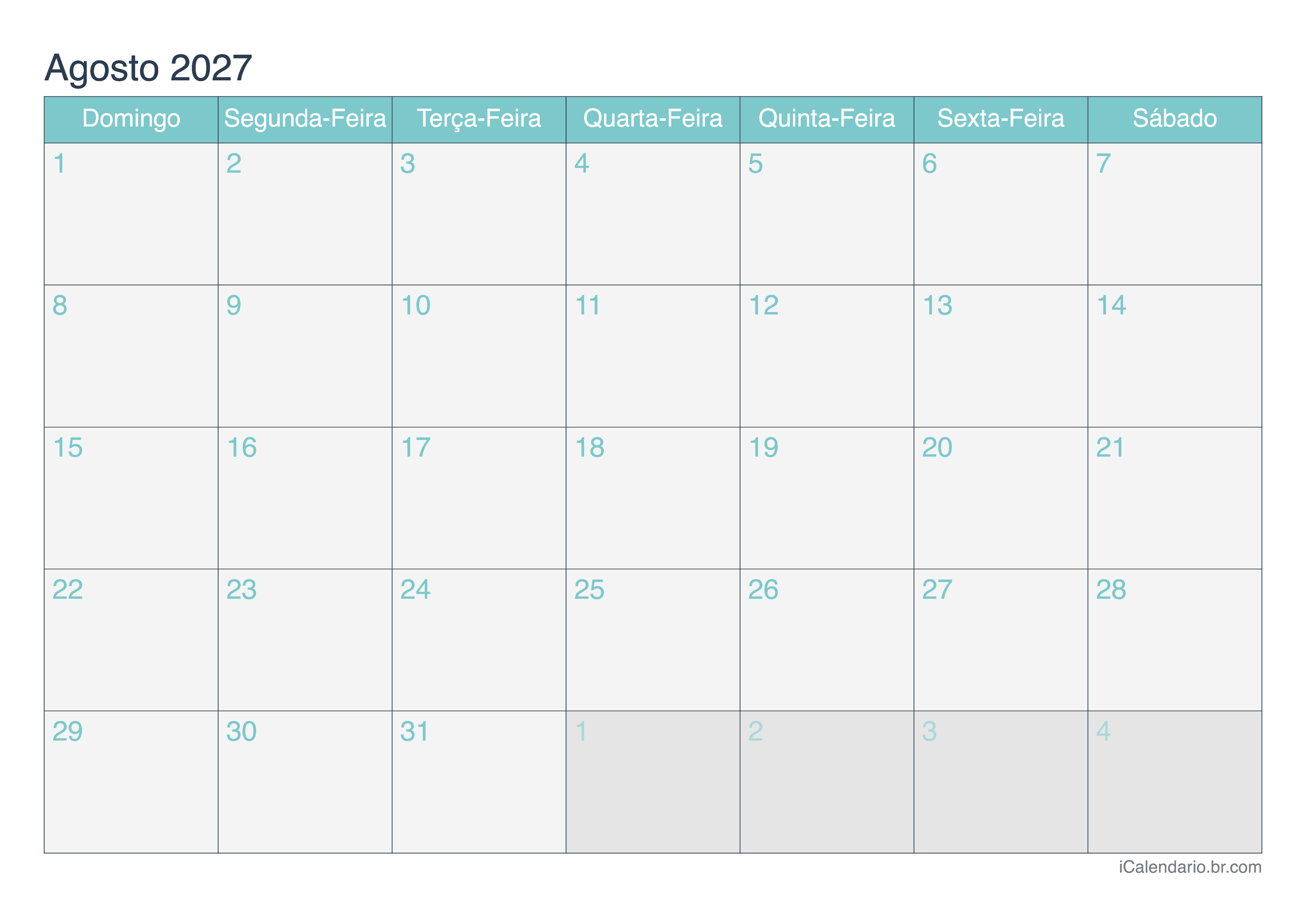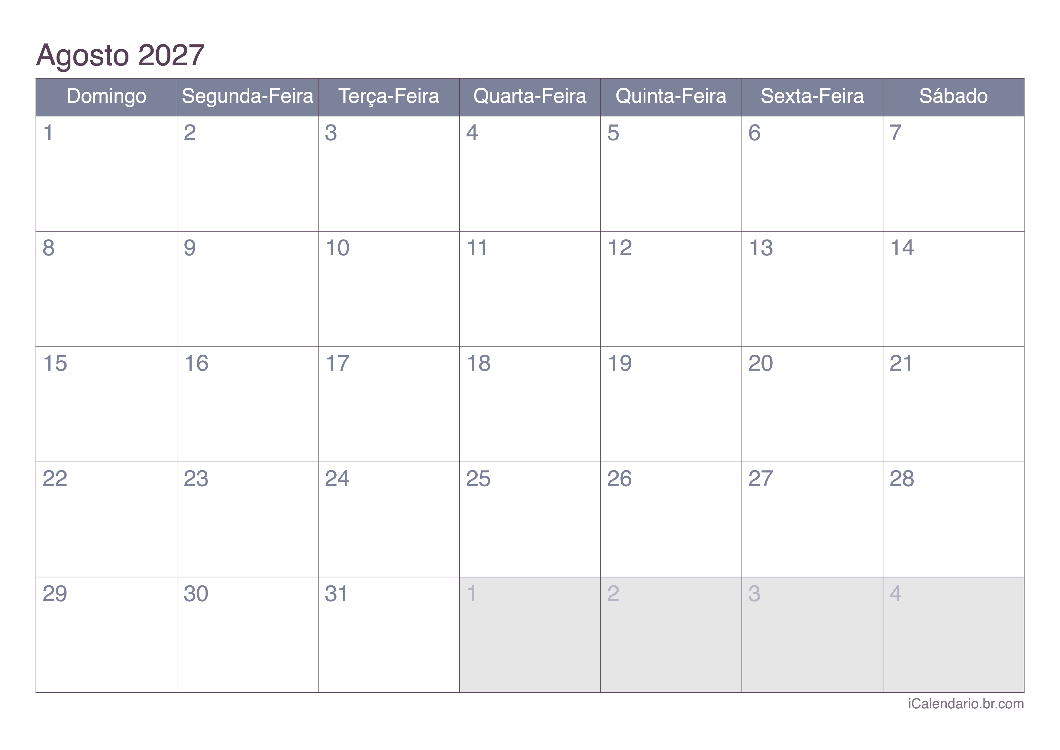 Você pode baixar e imprimir à vontade o calendário em branco do mês de agosto 2027, com espaço para anotações, disponível nos formatos de imagem, PDF e Excel. Você encontrará também, outros temas para o calendário de agosto 2027.