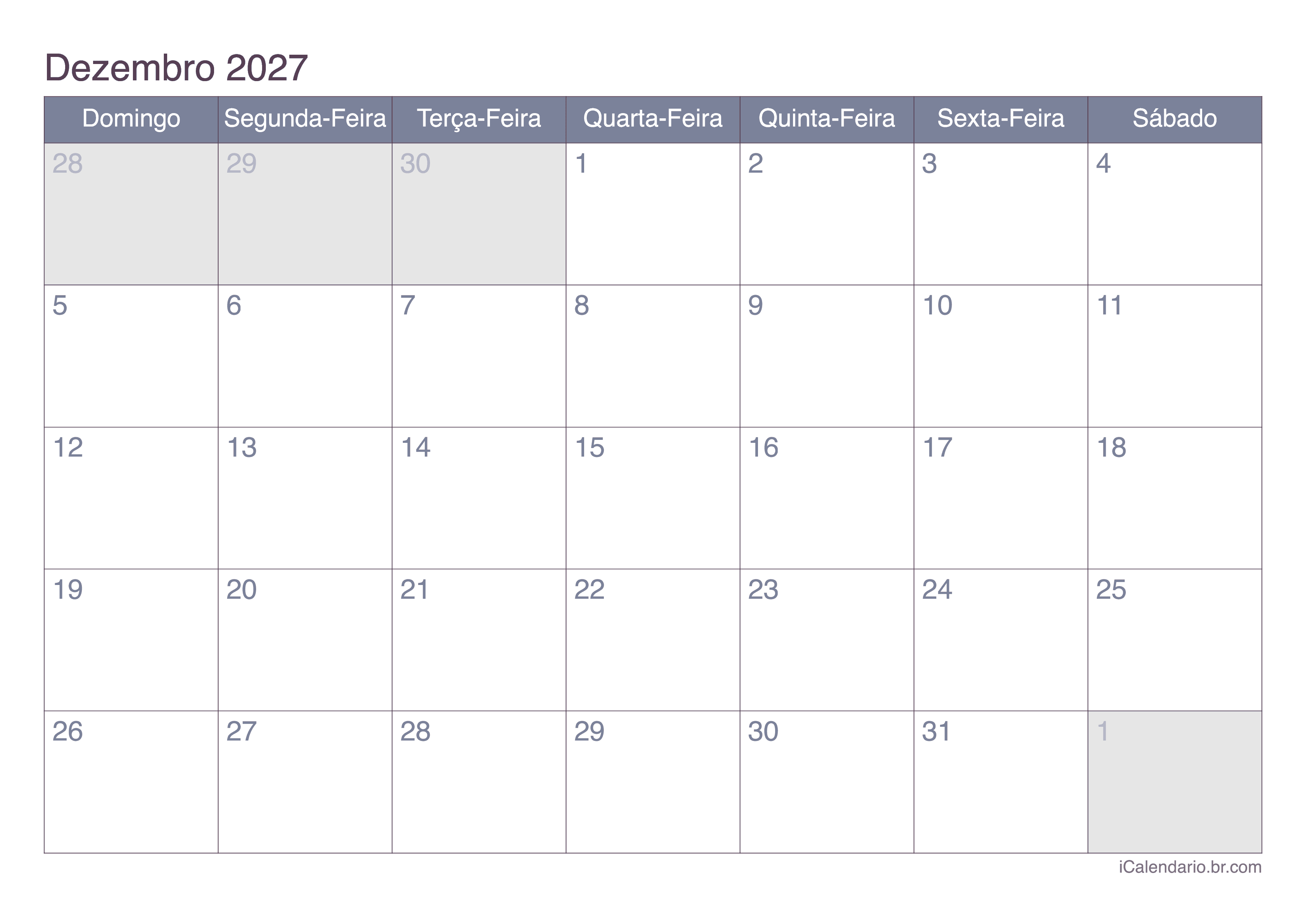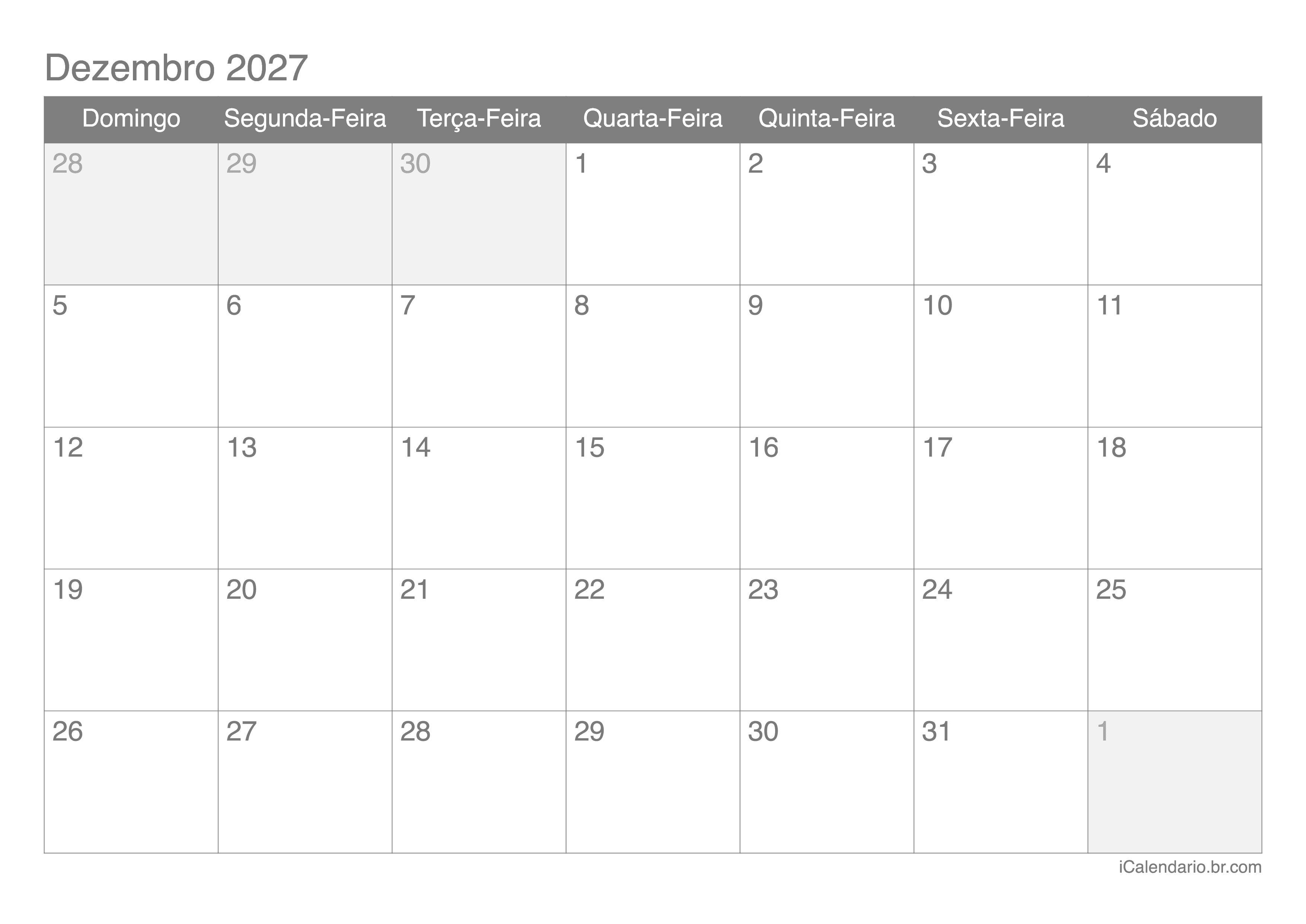 Você pode baixar e imprimir à vontade o calendário em branco do mês de dezembro 2027, com espaço para anotações, disponível nos formatos de imagem, PDF e Excel. Você encontrará também, outros temas para o calendário de dezembro 2027.