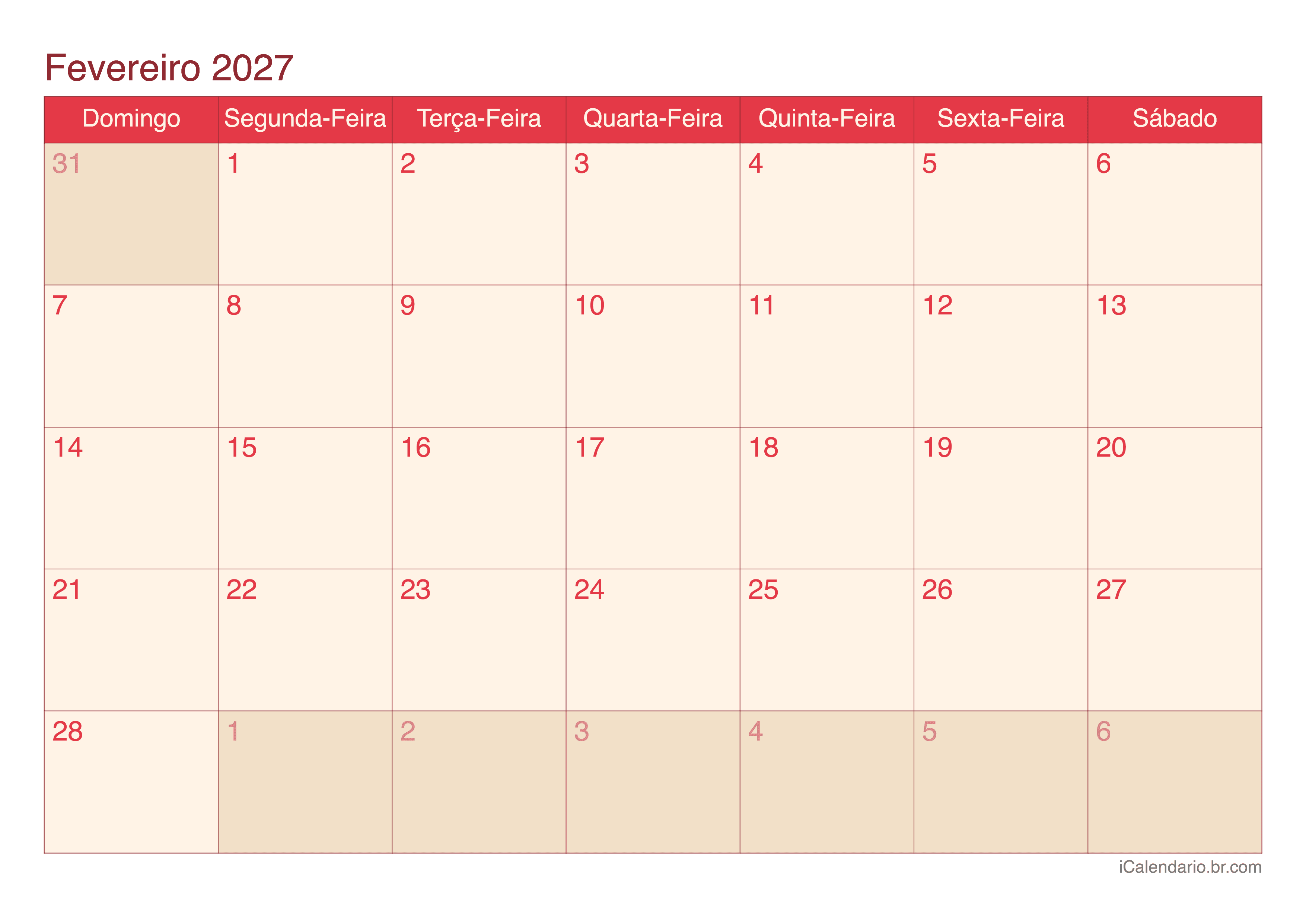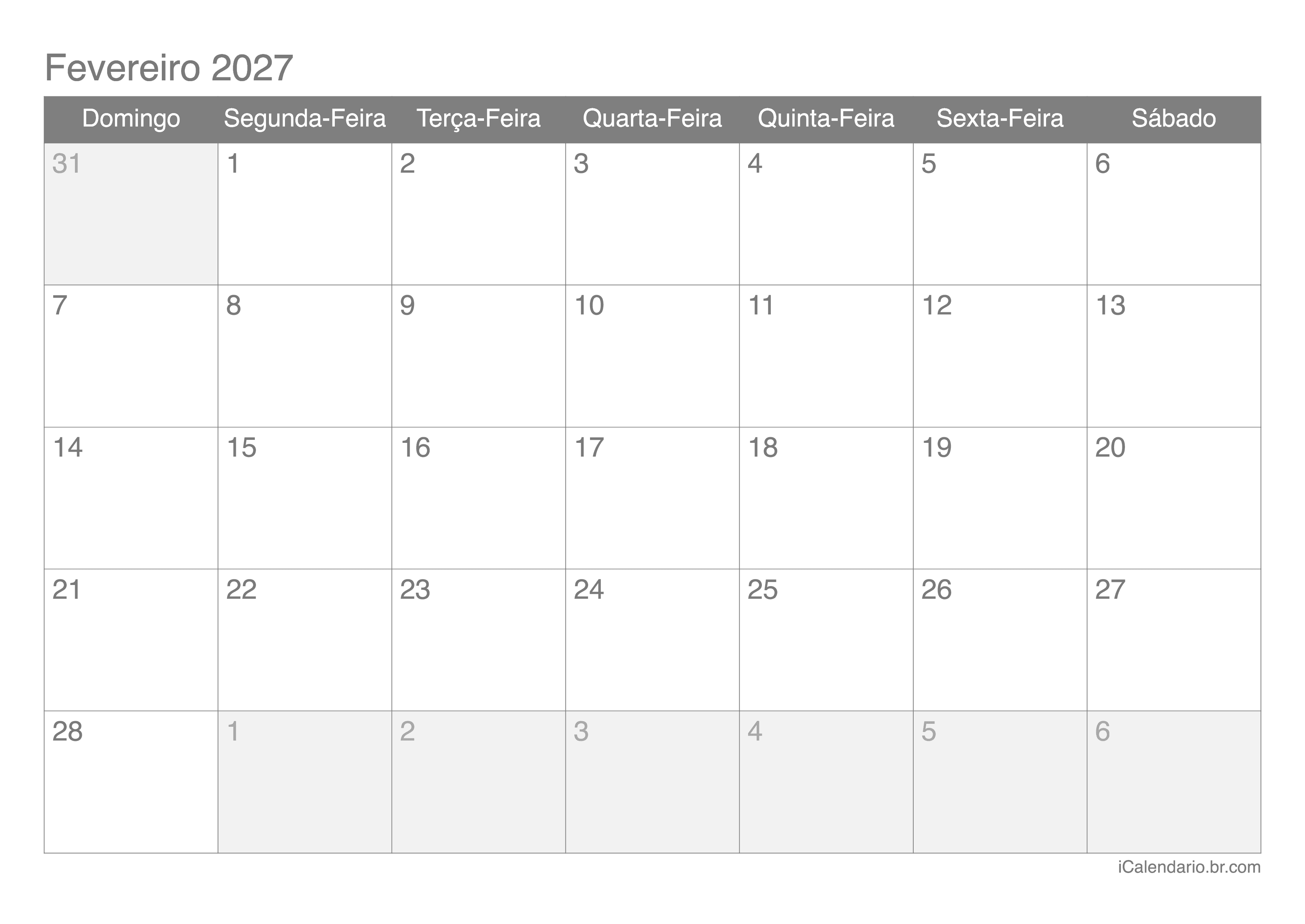 Você pode baixar e imprimir à vontade o calendário em branco do mês de fevereiro 2027, com espaço para anotações, disponível nos formatos de imagem, PDF e Excel. Você encontrará também, outros temas para o calendário de fevereiro 2027.