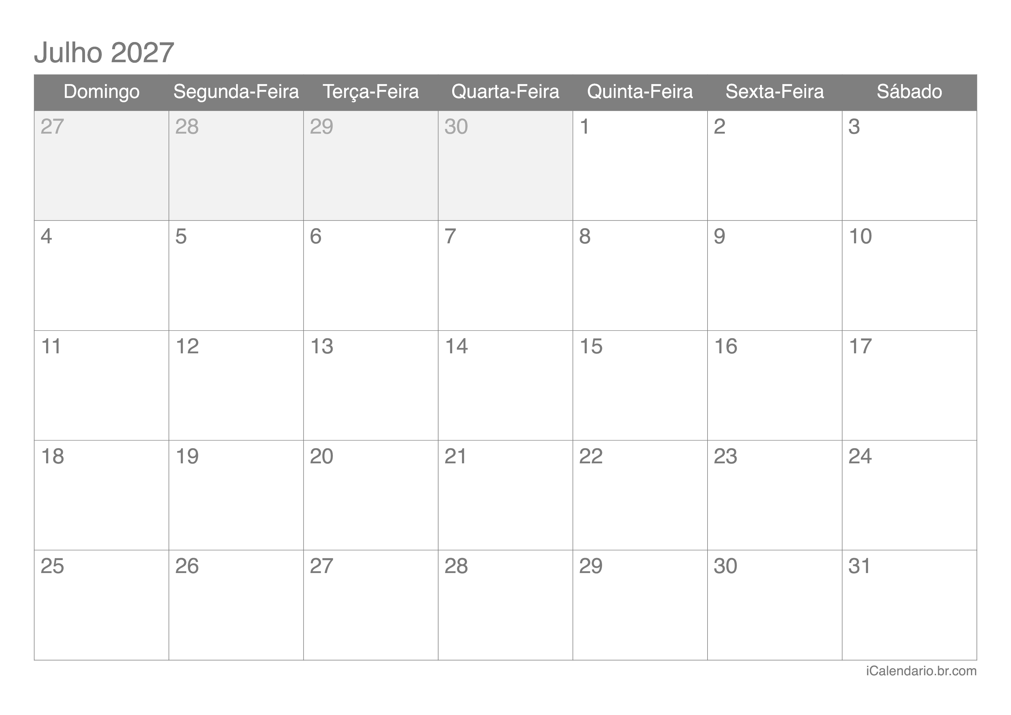 Calendário do mês de julho 2027 para imprimir