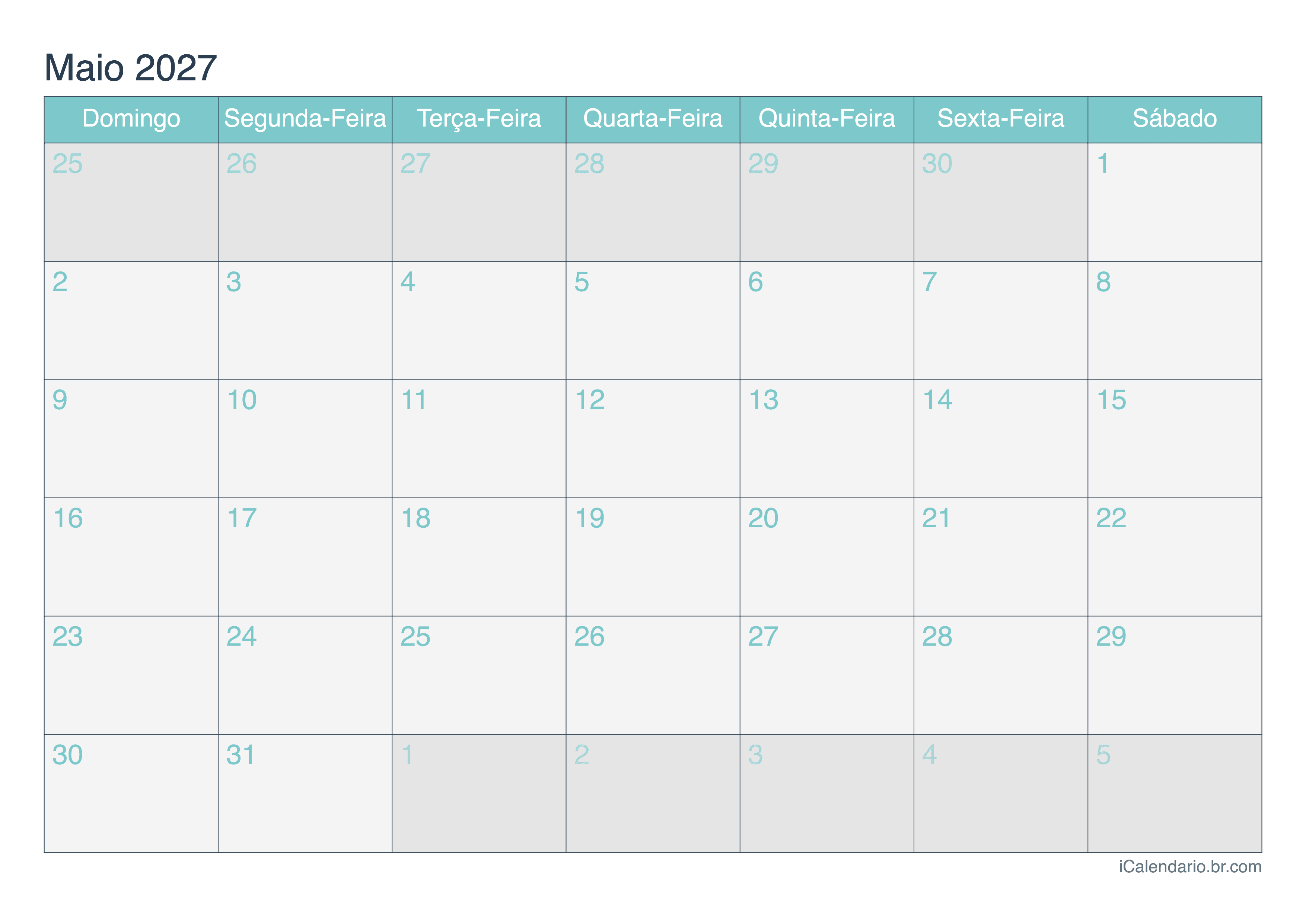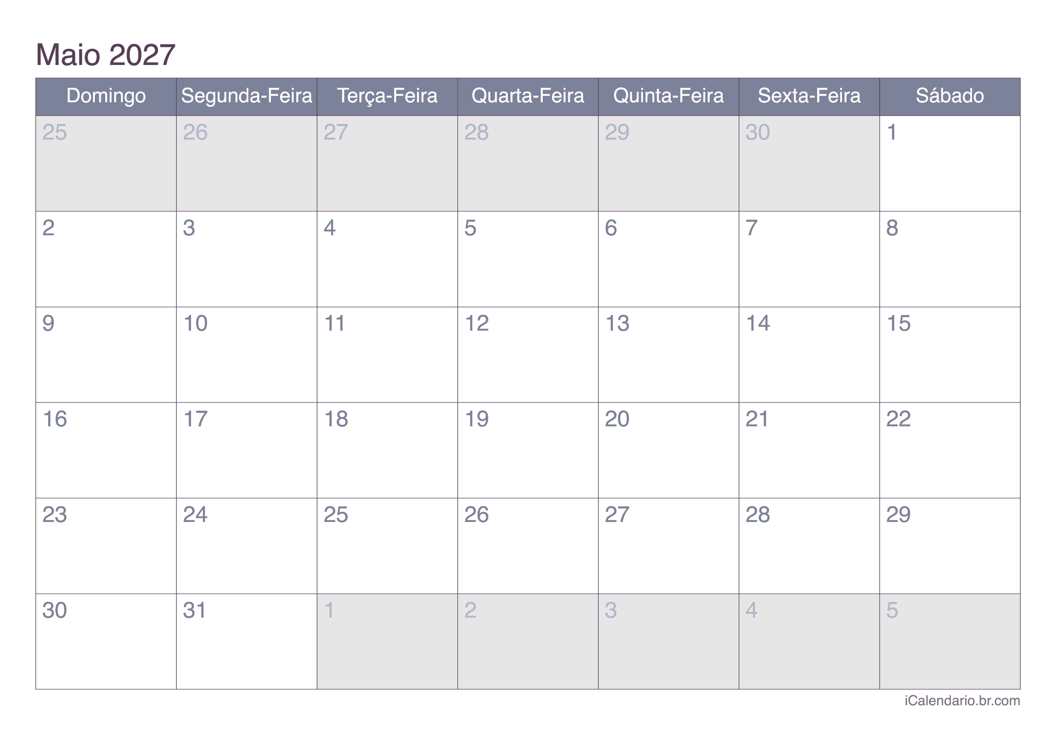 Você pode baixar e imprimir à vontade o calendário em branco do mês de maio 2027, com espaço para anotações, disponível nos formatos de imagem, PDF e Excel. Você encontrará também, outros temas para o calendário de maio 2027.