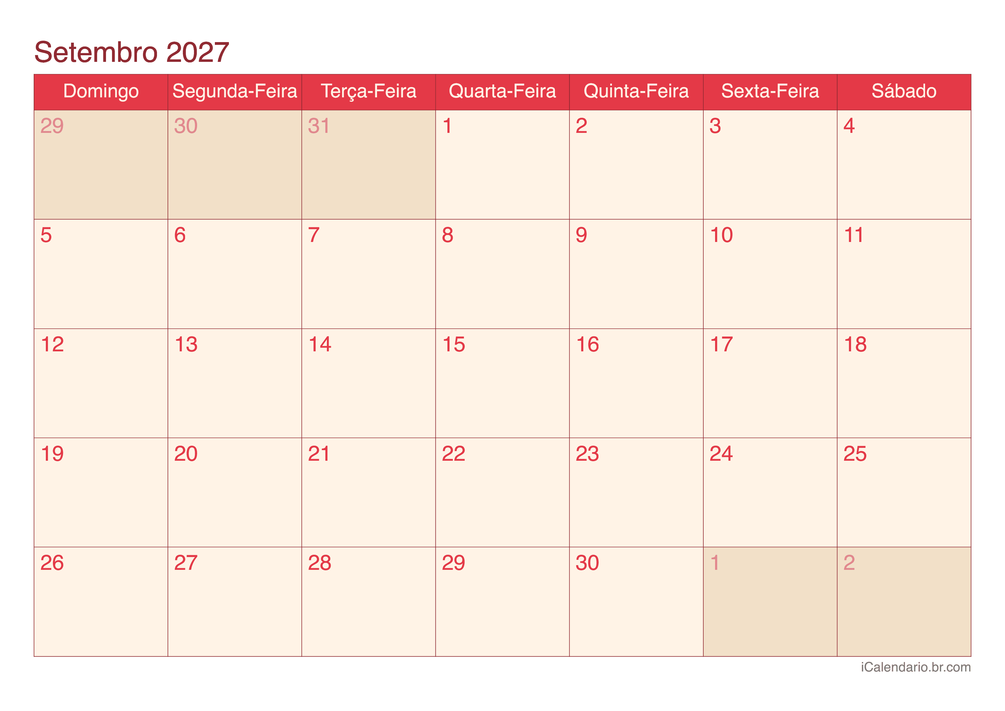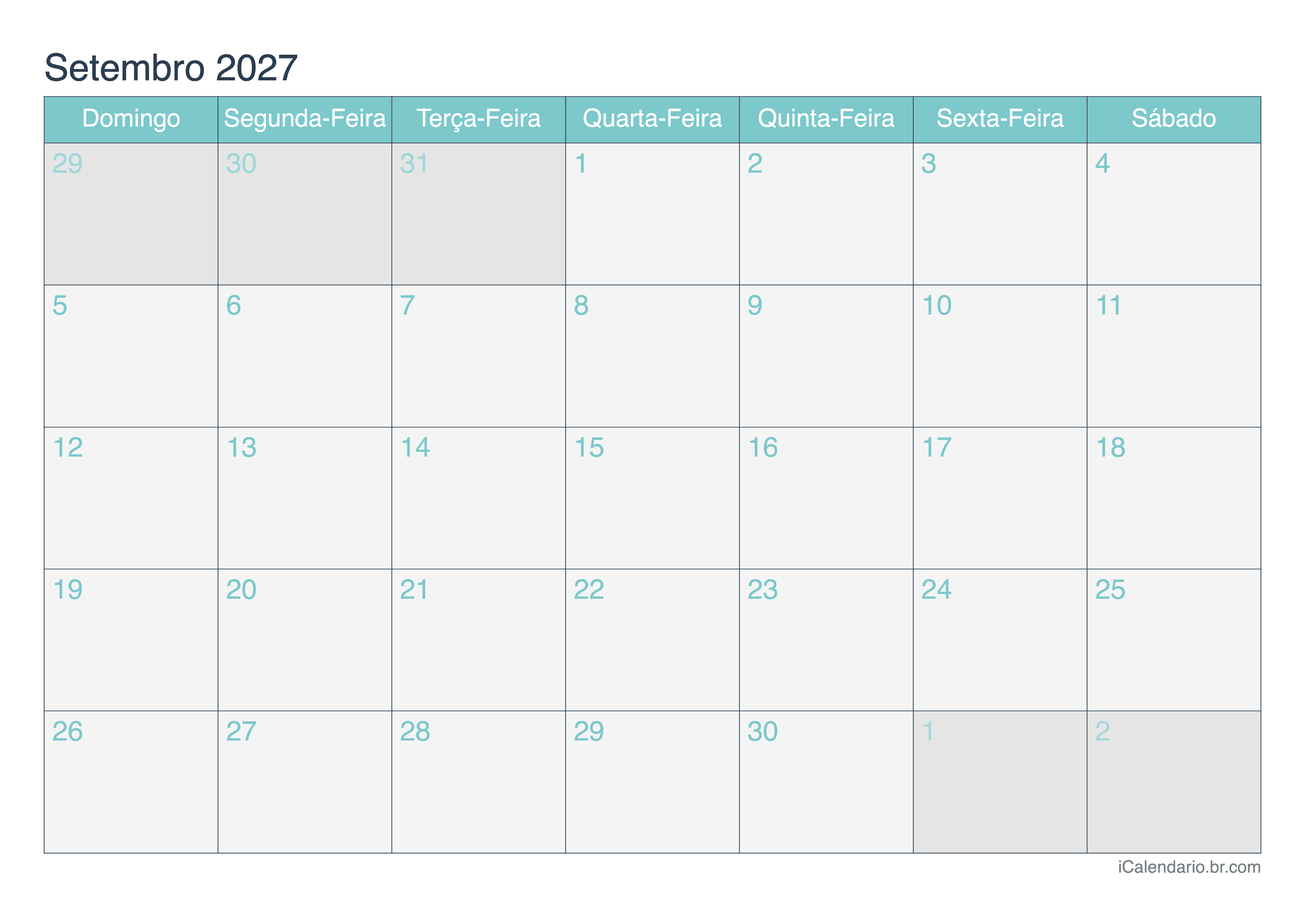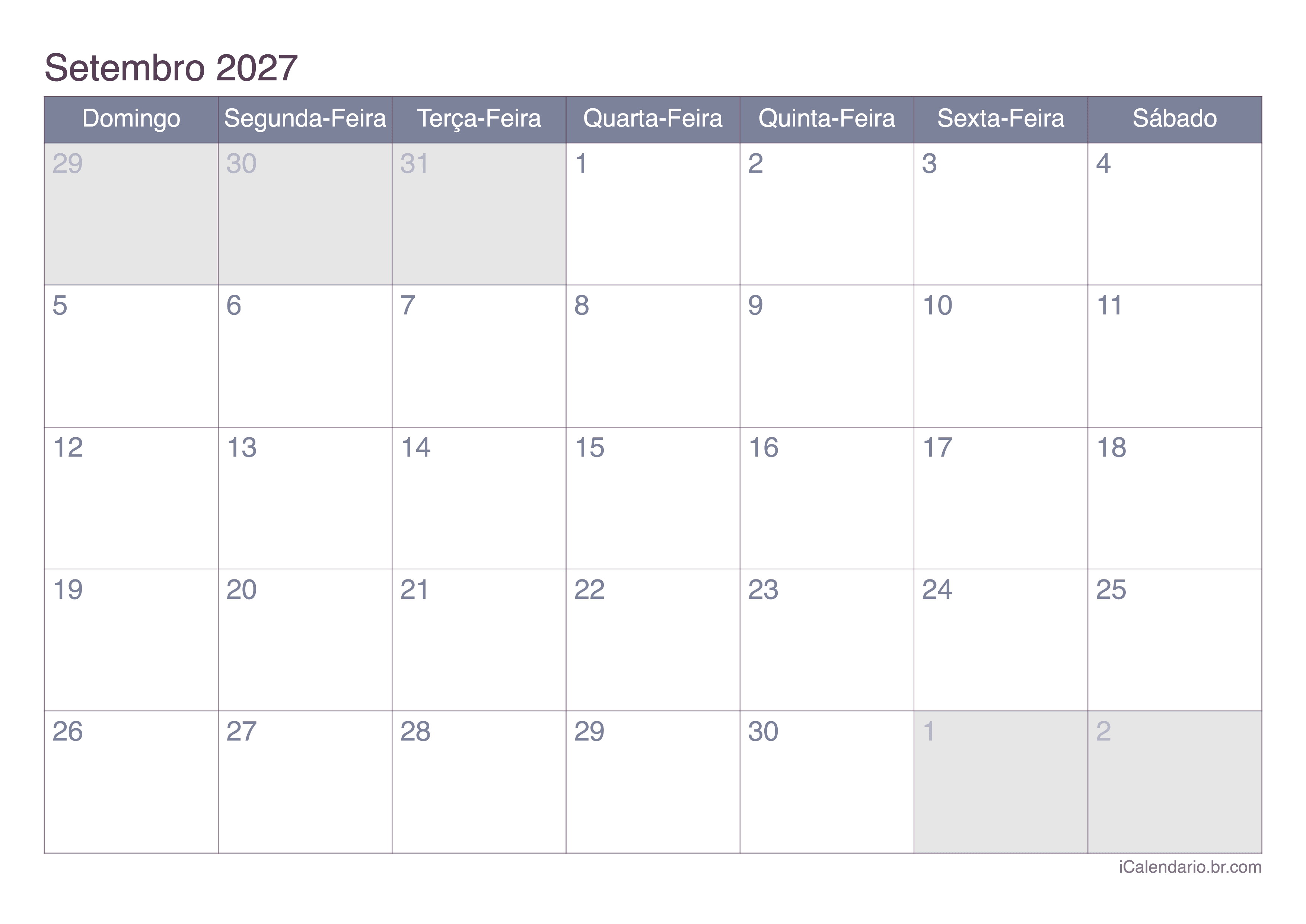 Você pode baixar e imprimir à vontade o calendário em branco do mês de setembro 2027, com espaço para anotações, disponível nos formatos de imagem, PDF e Excel. Você encontrará também, outros temas para o calendário de setembro 2027.